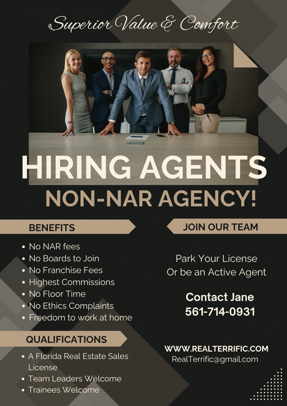 100% Commission Paid to Agents (No splits unless newly licensed agents need mentoring on their first few transactions)